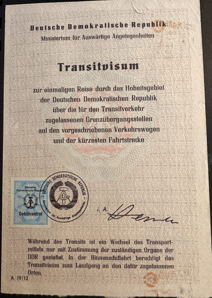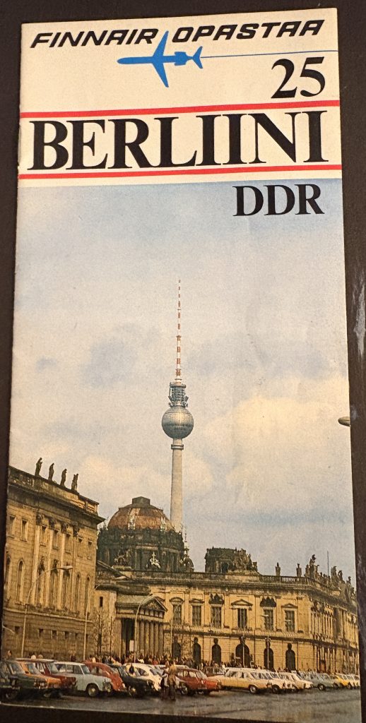 Lentokoneen kyljessä luki “Interflug”, eli kyseessä oli entisen Itä-Saksan kansallinen lentoyhtiö. Jouduimme matkustamaan Länsi-Berliiniin Itä-Berliinin kautta, koska Länsi-Berliiniin eivät saaneet liikennöidä kuin Länsiliittoutuneiden, eli Yhdysvaltojen, Englannin, Ranskan, ja lisäksi Länsi-Saksan lentoyhtiöt. Lentokoneessa saimme käteemme Finnairin painattaman matkaoppaan Itä-Berliiniin, koska Finnairin vinkkelistä Länsi-Berliiniä ei ollut olemassa. Kartassa sen kohdalla oli valkoinen kohta.