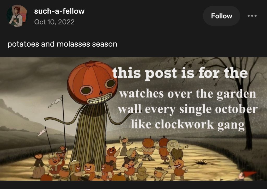 Tumblr-käyttäjä such-a-fellow:n julkaisu, jonka hän on osoittanut niille, jotka katsovat Over the Garden Wallin joka lokakuussa nimeten tämän Perunat ja melassit -ajaksi yhden sarjassa esitettävän laulun mukaan.