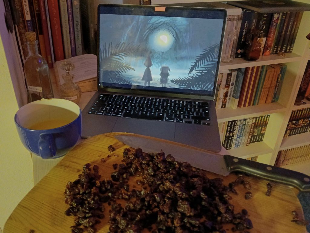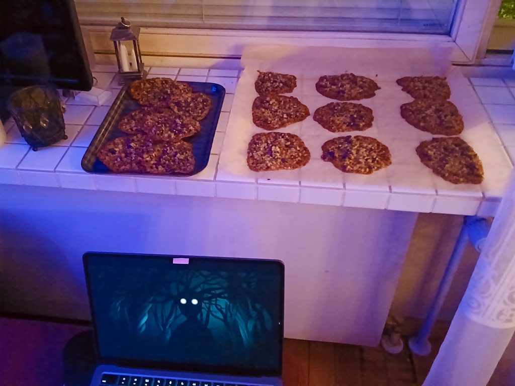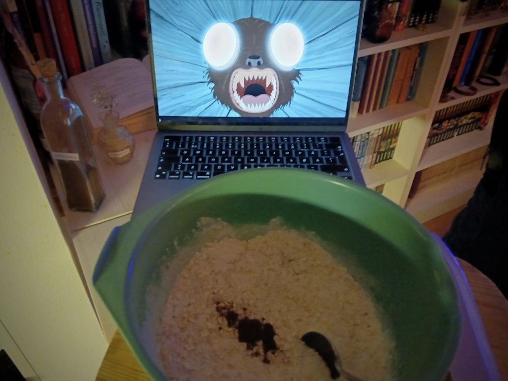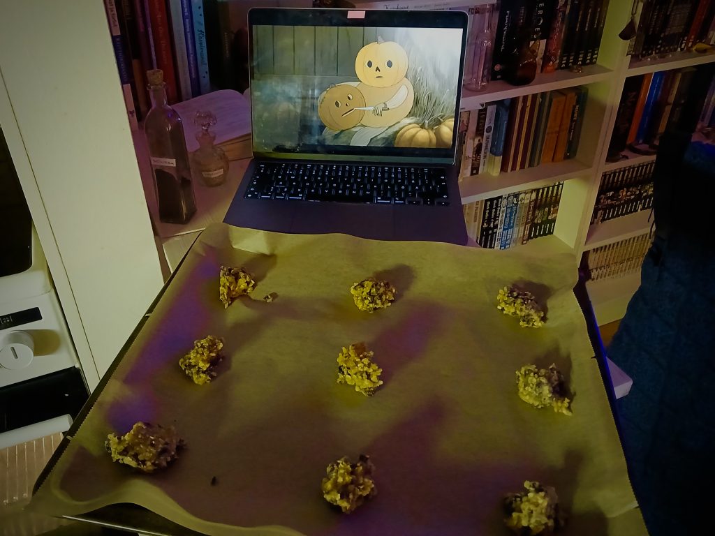 Over the Garden Wall sattuu myös olemaan juuri sopivan pituinen katsottava suosikkikeksieni leipomiseen! Olen kehittänyt oman mausteisten karpalokaurakeksien versioni Kotiruoka-kirjan kauralastujen reseptin pohjalta. Tosin minun versiostani ei tule kauralastuille tyypillisen rapsakoita, koska leipominen on kemiaa ja minä tykkään sooloilla.
