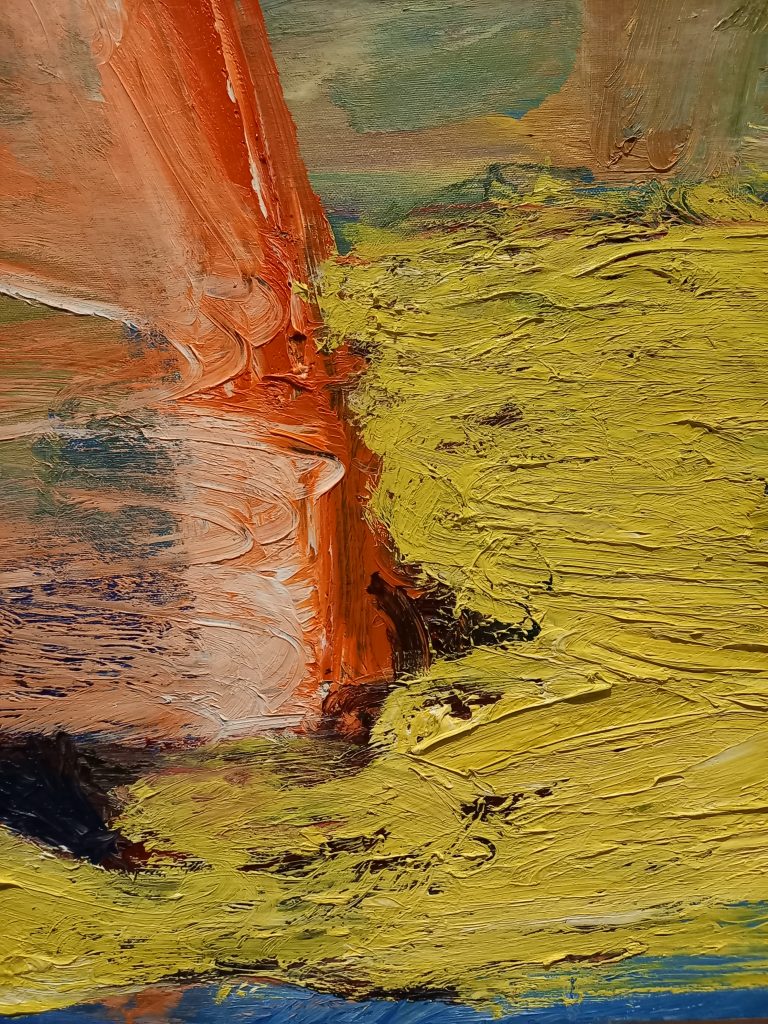 Rintalastan alle käpertyvää pörröistä mielihyvää aiheuttaneita värejä, tekstuureja ja siveltimen liikkeitä Auli Järvelän teoksessa Syksy II (1997, yksityiskohta). Esillä HAMin näyttelyssä Vapaa 90.