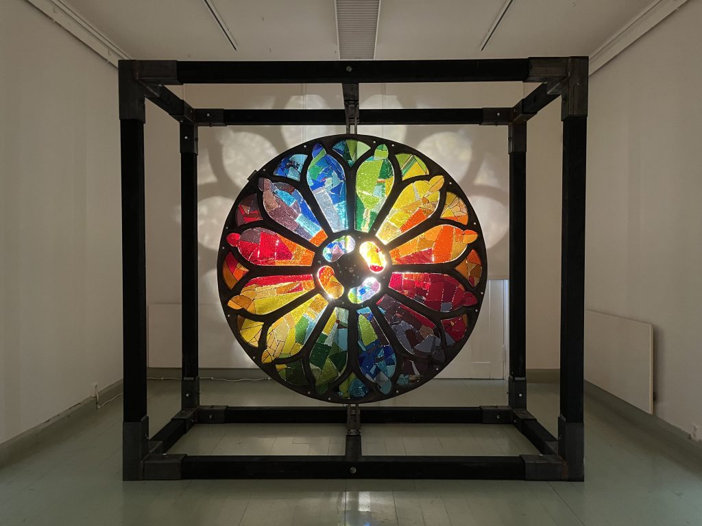 Ihana Ruusuikkuna on installaatio. Teos on osa suurempaa Hyvän ja pahan kone installaatiokokonaisuutta. Teoksen mitat: Korkeus 215 cm, leveys 215 cm ja syvyys 100 cm. Installaatio rakentuu pyörivästä lasimaalauksesta (Veistos pyörii hitaan sähkömoottorin voimalla.) Kaikki nämä elementit on rakennettu puisen kehikon/modulin sisään. Kokonaisuus valaistaan takaa tulevalla valolla, joka maalaa ja heijastaa tilaan valomaauksen. Teos rakennetaan näyttelytilan perälle, se luo tilaan värillisen valotilan.
