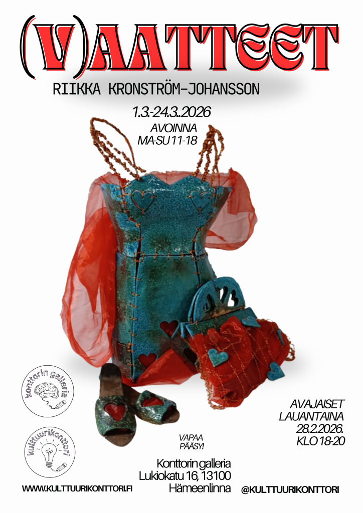 Konttorin galleriaan avautuu maaliskuussa näyttely, jossa vaatteet eivät ole käyttöesineitä vaan veistoksia. Kotkalainen kuvataiteilija Riikka Kronström-Johansson tuo Hämeenlinnaan kokonaisuuden nimeltä (V)aatteet, jossa keramiikka, kangas ja kierrätysmateriaalit rakentuvat naisten puvuiksi, mekoiksi, korseteiksi, kengiksi, laukuiksi ja hatuiksi.