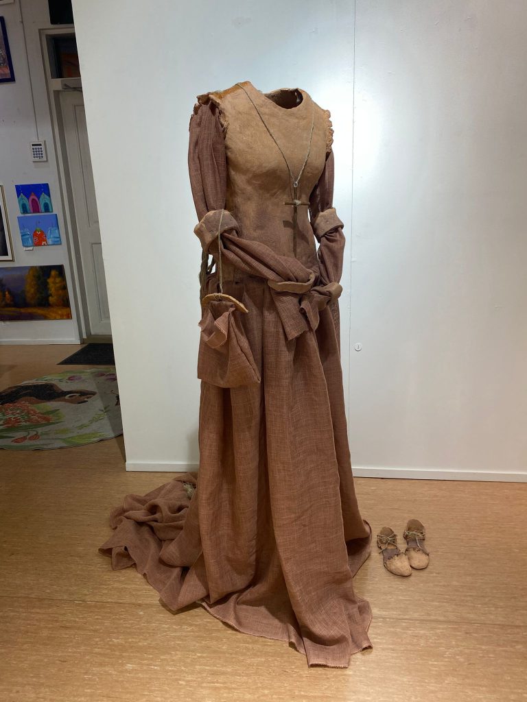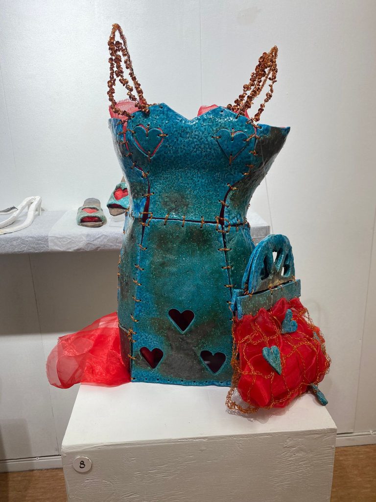 Kulttuurikonttorin Gallerian kevätkauden avaa kotkalaisen kuvataiteilija Riikka Kronström-Johanssonin näyttely, jossa pukeutuminen nousee kolmiulotteisen taiteen keskiöön. Taiteilija on luonut keramiikasta ja kierrätysmateriaaleista naisten pukuja, mielenkiintoisia asukokonaisuuksia, laukkuineen ja hattuineen, jotka herättävät katsojan pohtimaan vaatteiden merkitystä. Saatesanojen mukaan näyttely kutsuu pohtimaan suojaavatko vaatteet meitä- vai paljastavatko ne lopulta enemmän kuin arvaammekaan. Tämä kysymys mielessäni, lähdin väijymään näyttelyn antia.